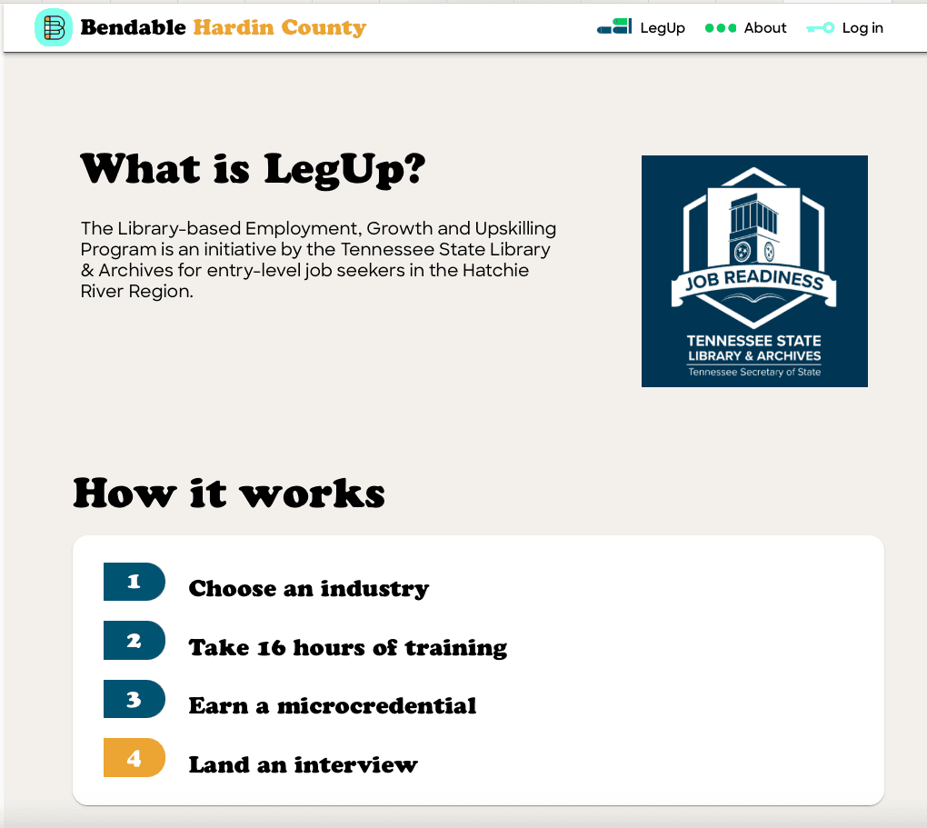 Also in July, we launched the Library-based Employment, Growth and Upskilling Program, or LegUp, through 18 public libraries in the Hatchie River Region of West Tennessee. Local residents participating in LegUp are able to earn a microcredential backed by the Tennessee State Library & Archives by completing 16 hours of online training in foundational work skills (time management, problem-solving, teamwork, etc.) with an introduction to one of three major industries (manufacturing, warehousing or healthcare). A dozen major employers that have joined the program have agreed, when there are available entry-level job openings, to guarantee interviews to those who have completed the training.